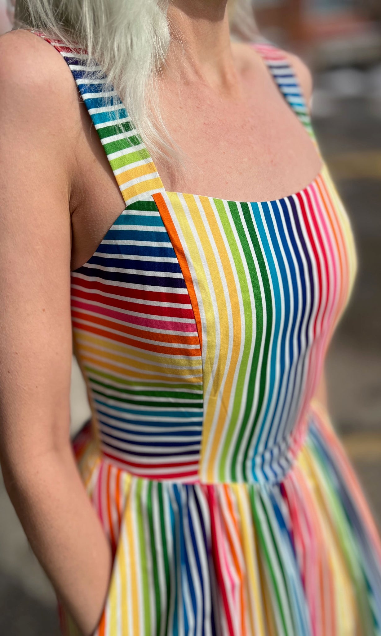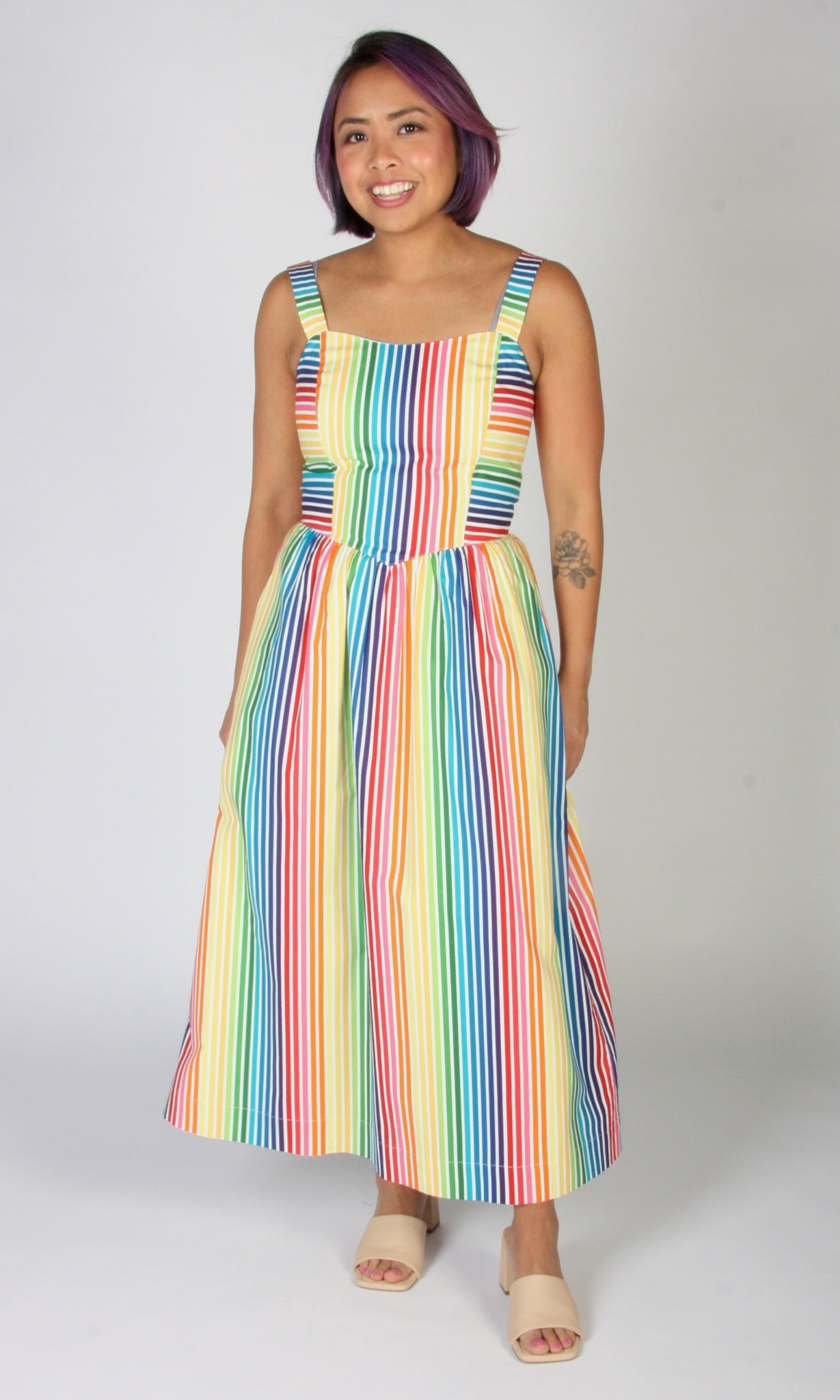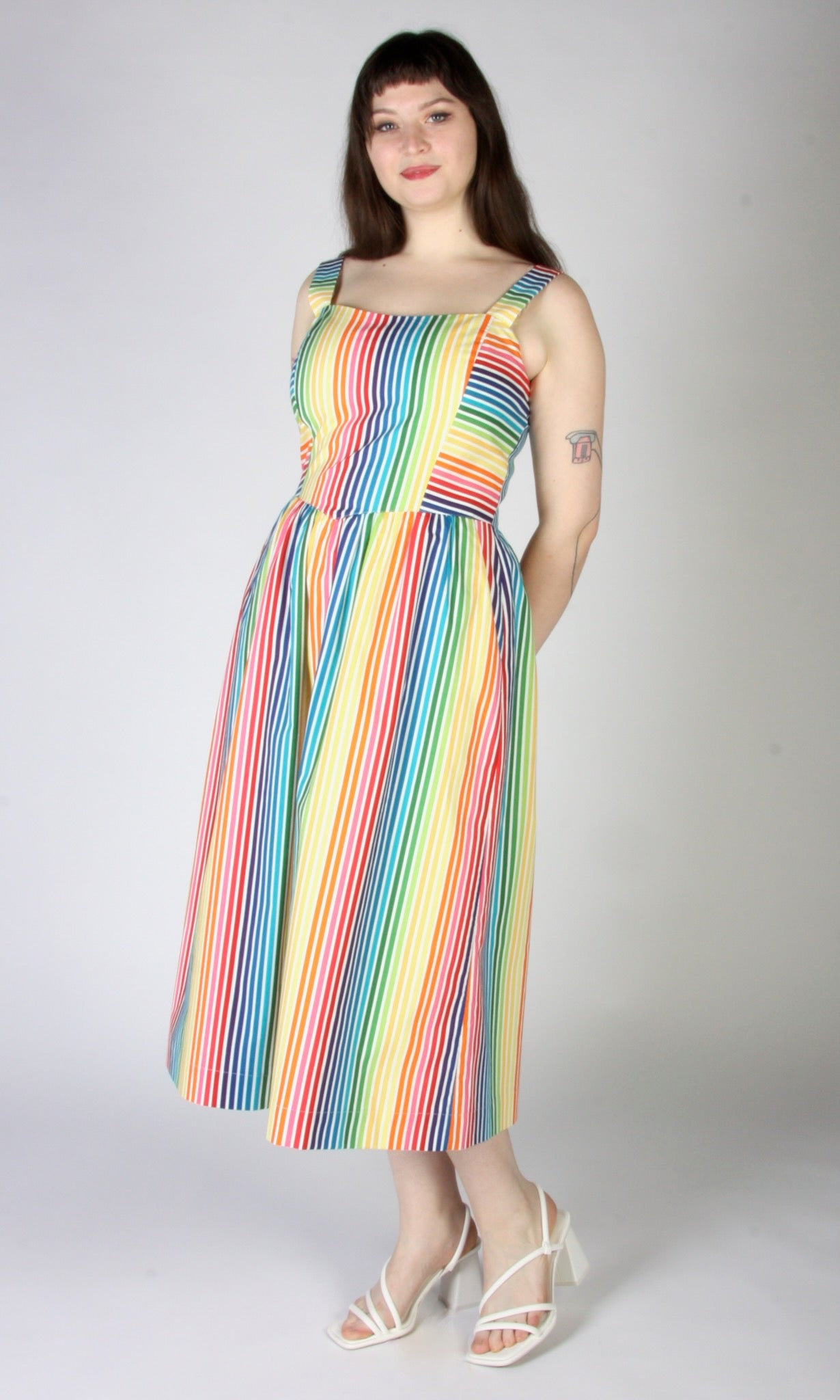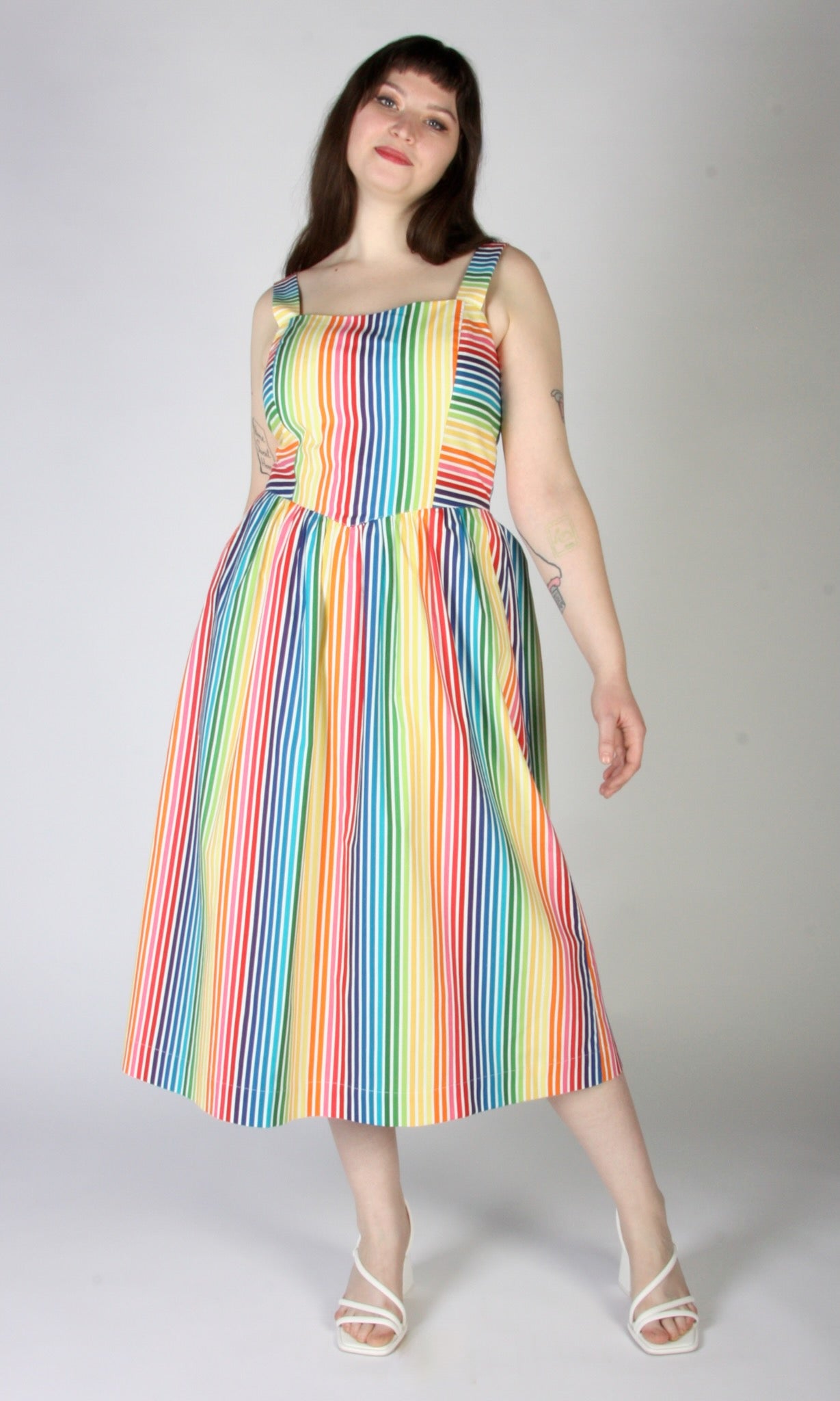 Heathwren is a whimsical summer sundress, with pockets and a sweetheart neckline, made of beautiful rainbow striped cotton. The yoked waist drops to a point at front and back, where it joins a gathered skirt. Heathwren is also available in ZigZag!