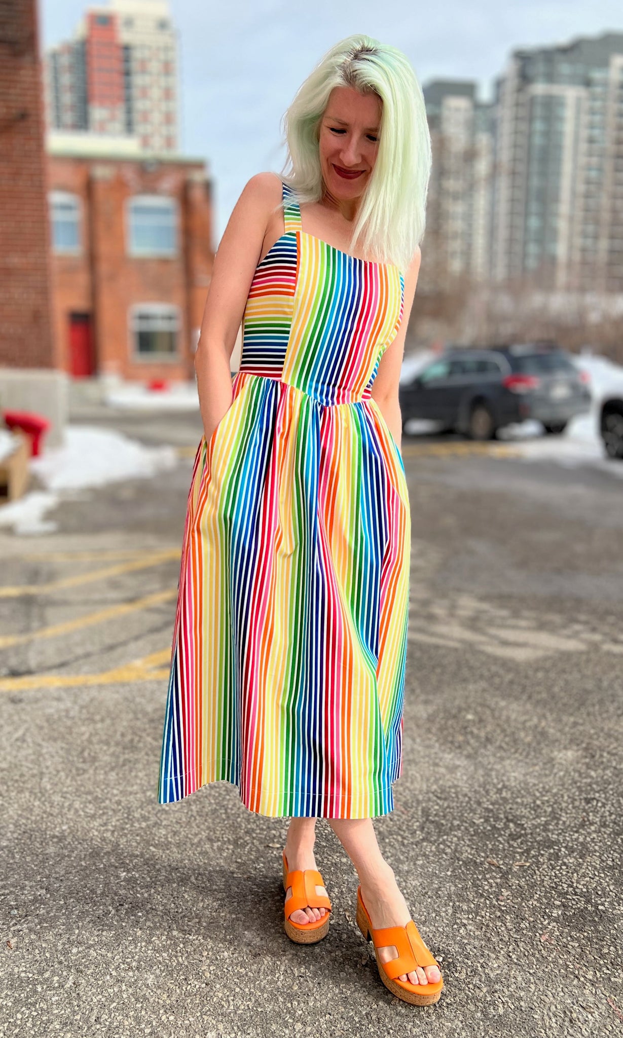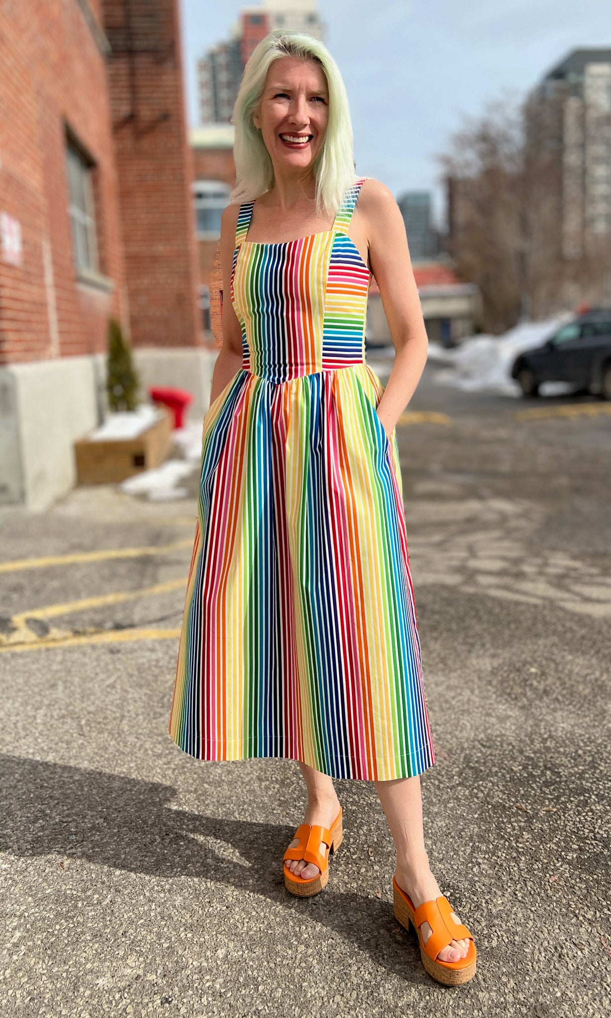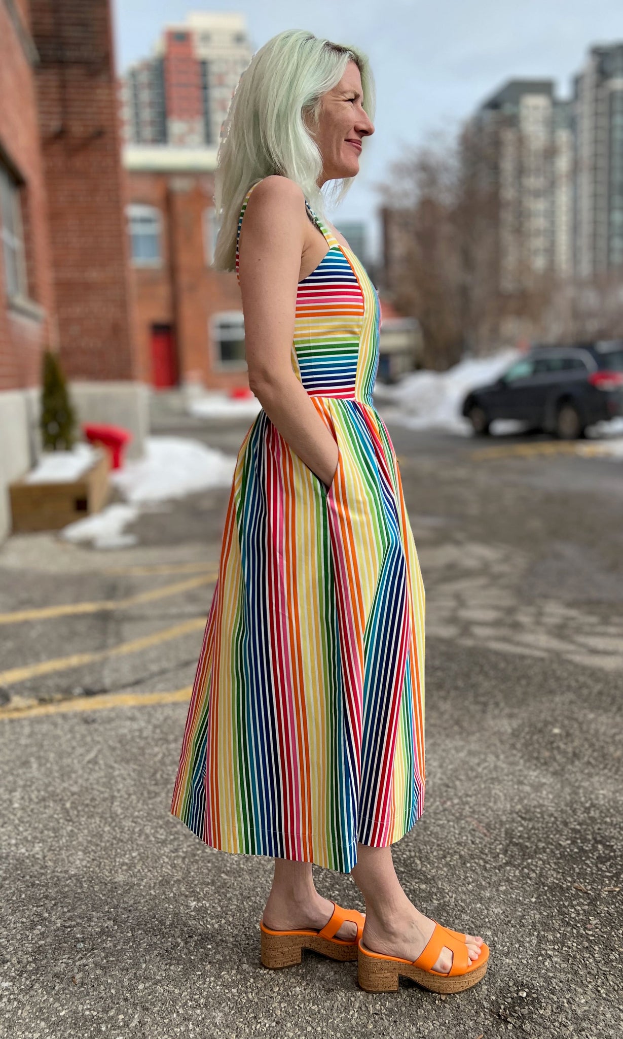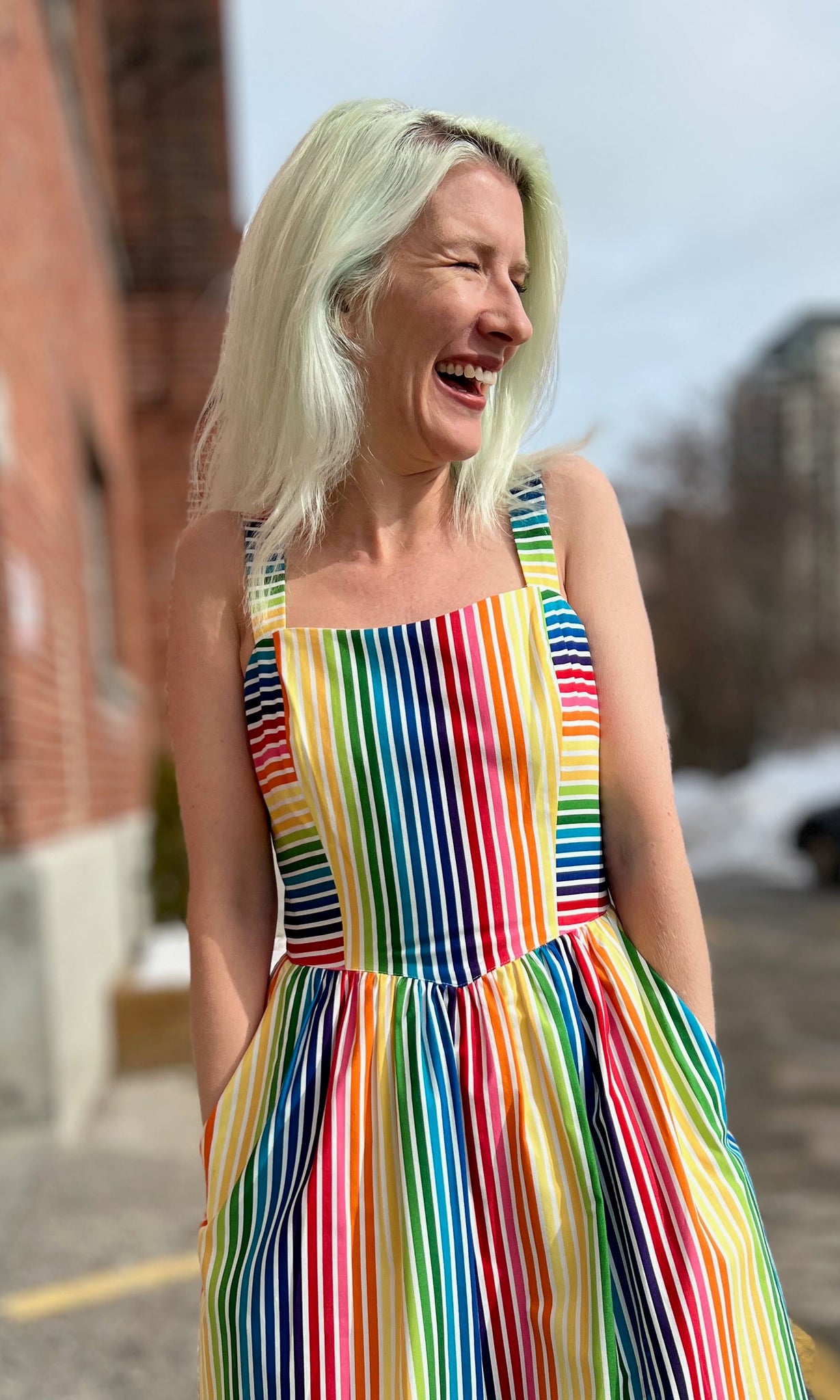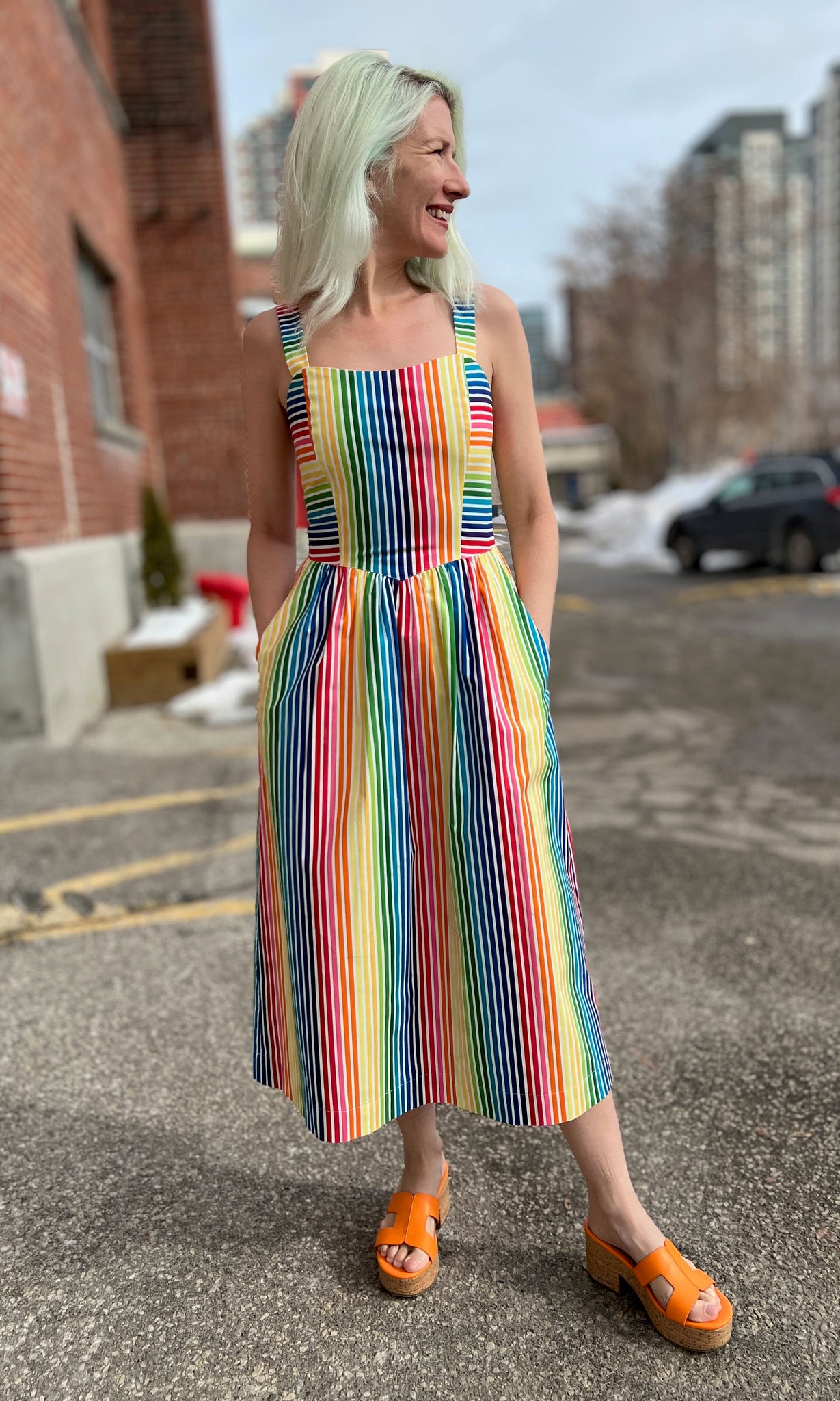 Heathwren is a whimsical summer sundress, with pockets and a sweetheart neckline, made of beautiful rainbow striped cotton. The yoked waist drops to a point at front and back, where it joins a gathered skirt. Heathwren is also available in ZigZag!