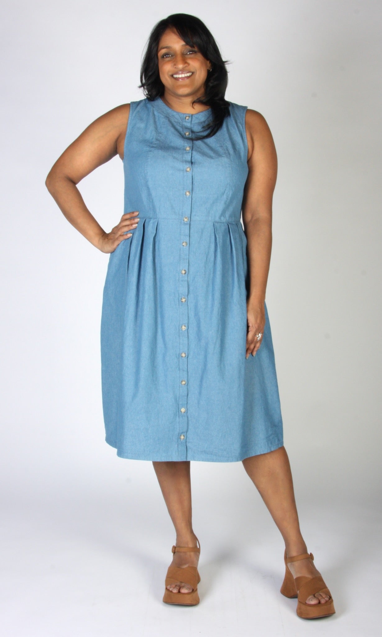 Thunder Pumper is a relaxed fit dress with a front button placket, pleats at the waist and pockets in the skirt. It's made of a very soft, lightweight OEKO-TEX certified cotton denim, and the dress has been pre-washed! This style is also available in Dark Wash.