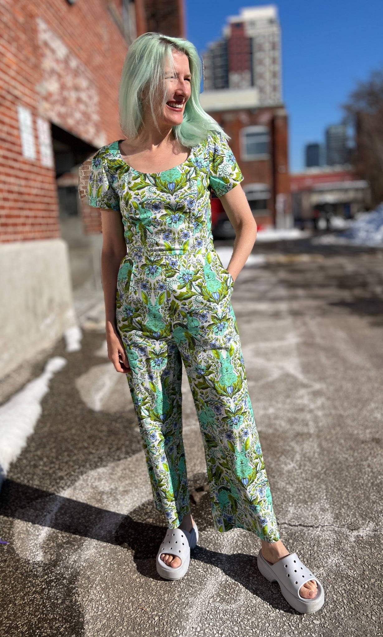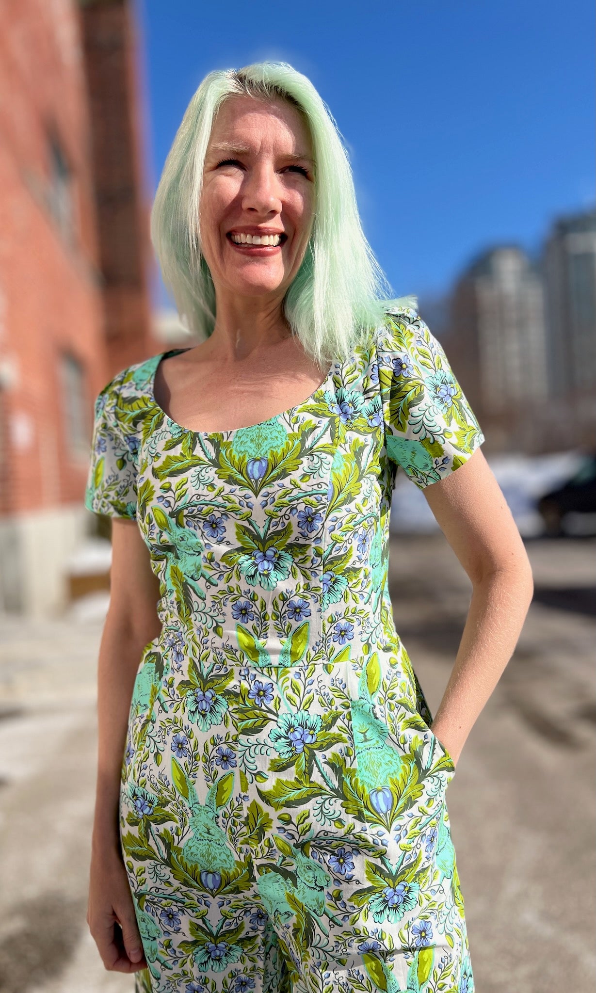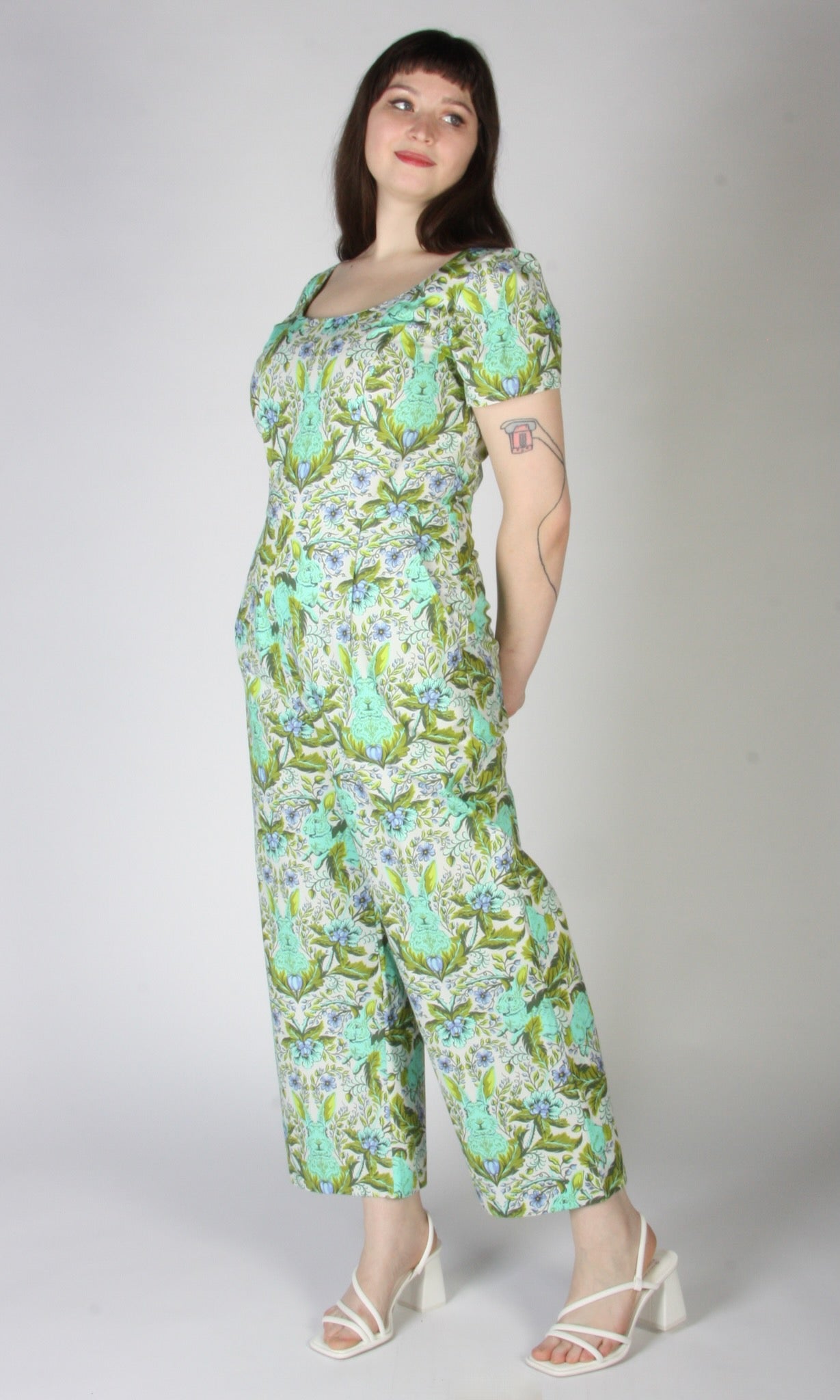 Our Whinchat is back in beautiful new cotton prints! This jumpsuit has cropped, wide legs, short sleeves and a lovely scooped neck. There are pockets in the pants, and it closes with a back invisible zipper. It is made of 100% cotton.