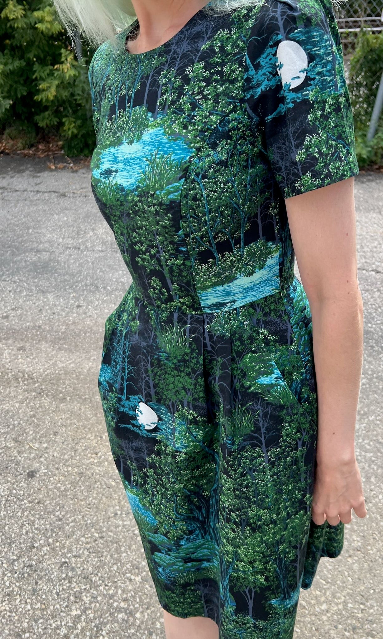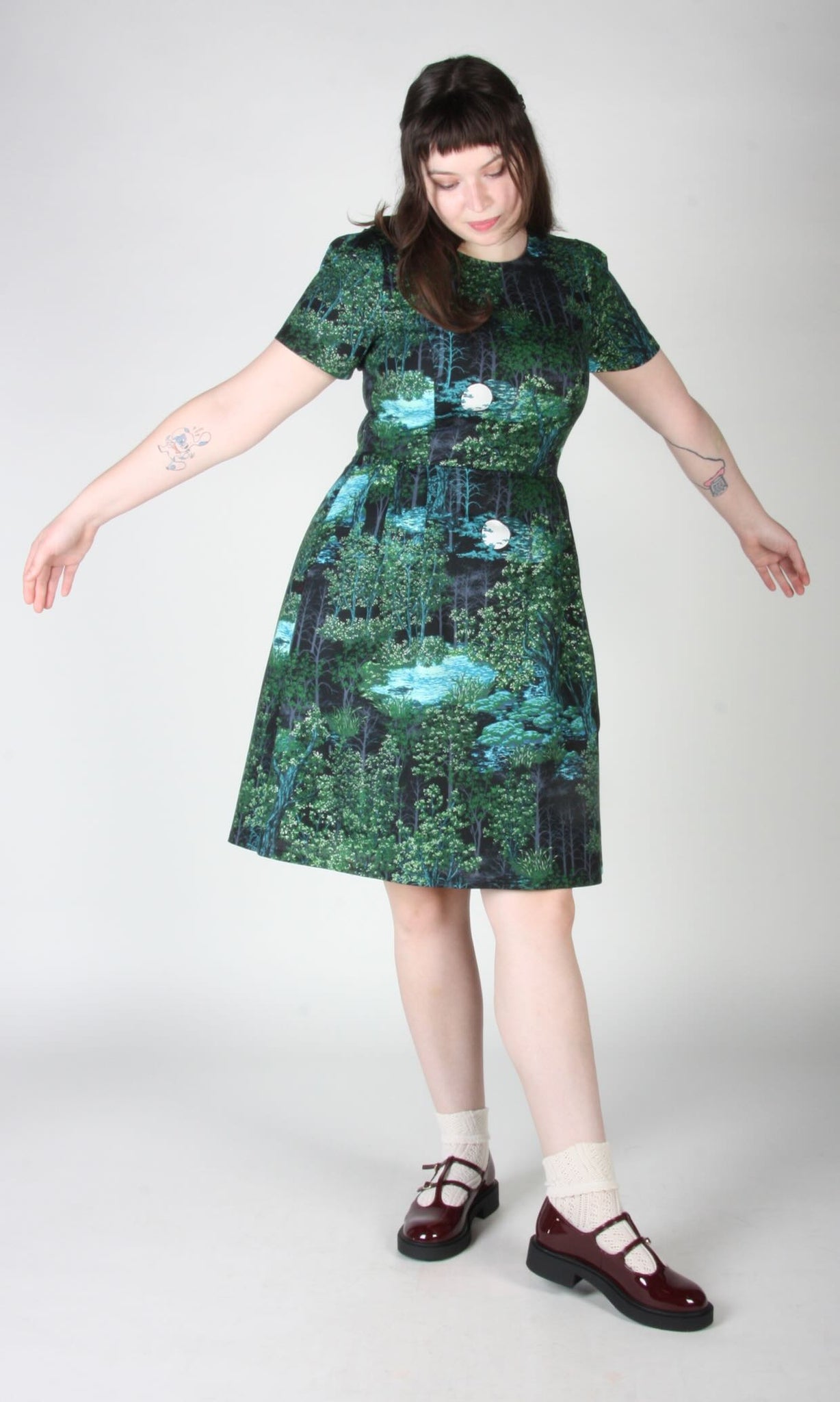 We first used Sleepwalker in our FW21 collection, and I have honestly never gotten over it! If I had to choose my one favourite fabric of all time, this one would be it. It has such a beautiful, gloomy gothic vibe with its rich green nighttime forest scene and full moon. We had it custom re-printed for the season and I'm so happy to have it back in our collection!