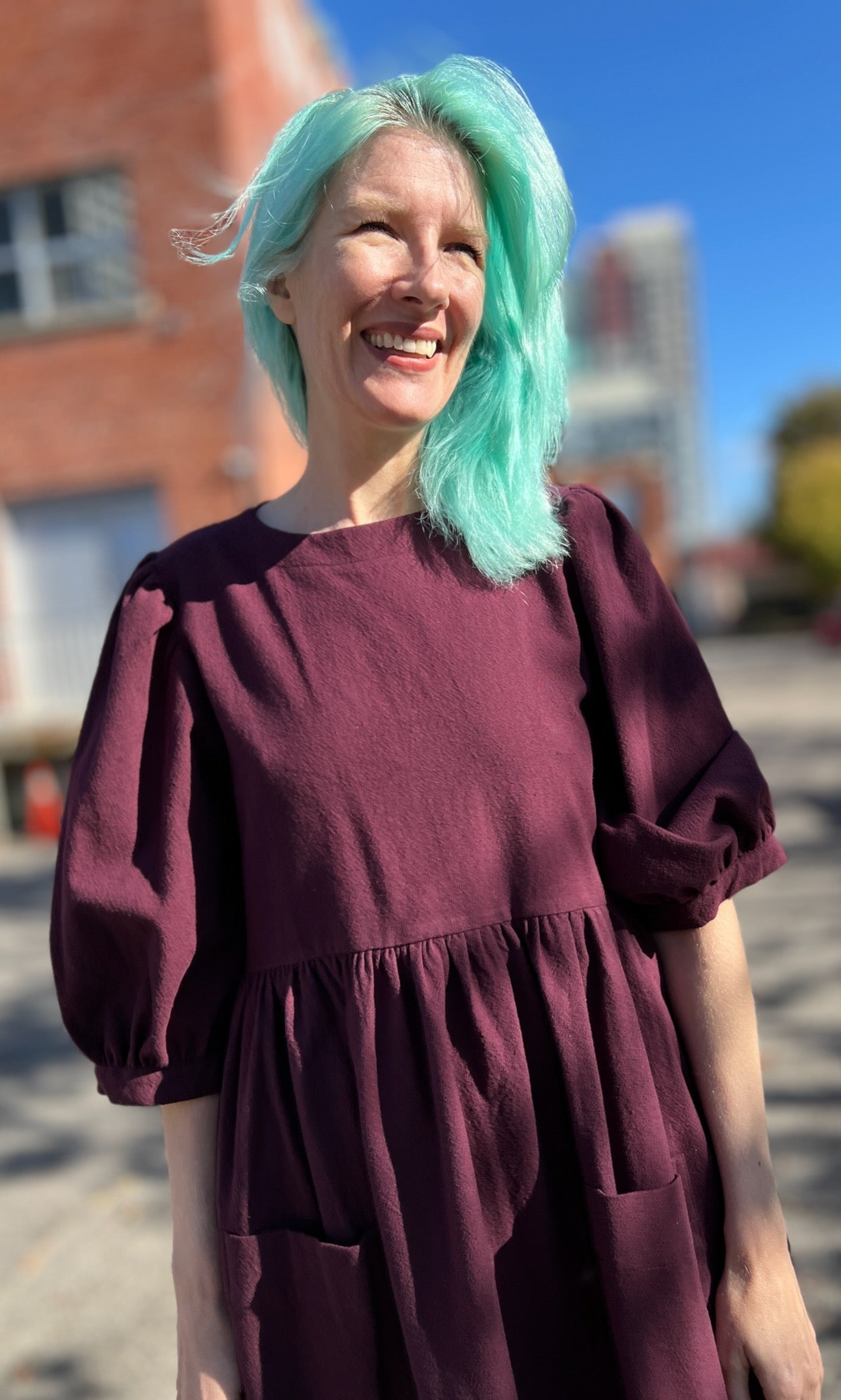 Flowerpiercer is a relaxed fit dress made of thick, textured 100% cotton.. It has in-seam skirt pockets and full sleeves that gather into a cuff. It pops on over the head, and closes with a button and loop at the back neck. Flowerpiercer is also available in Rust, Indigo and Black!