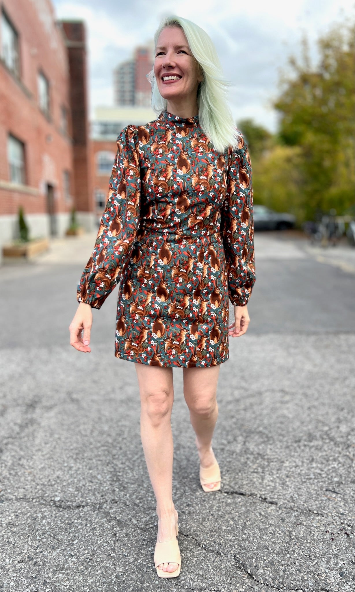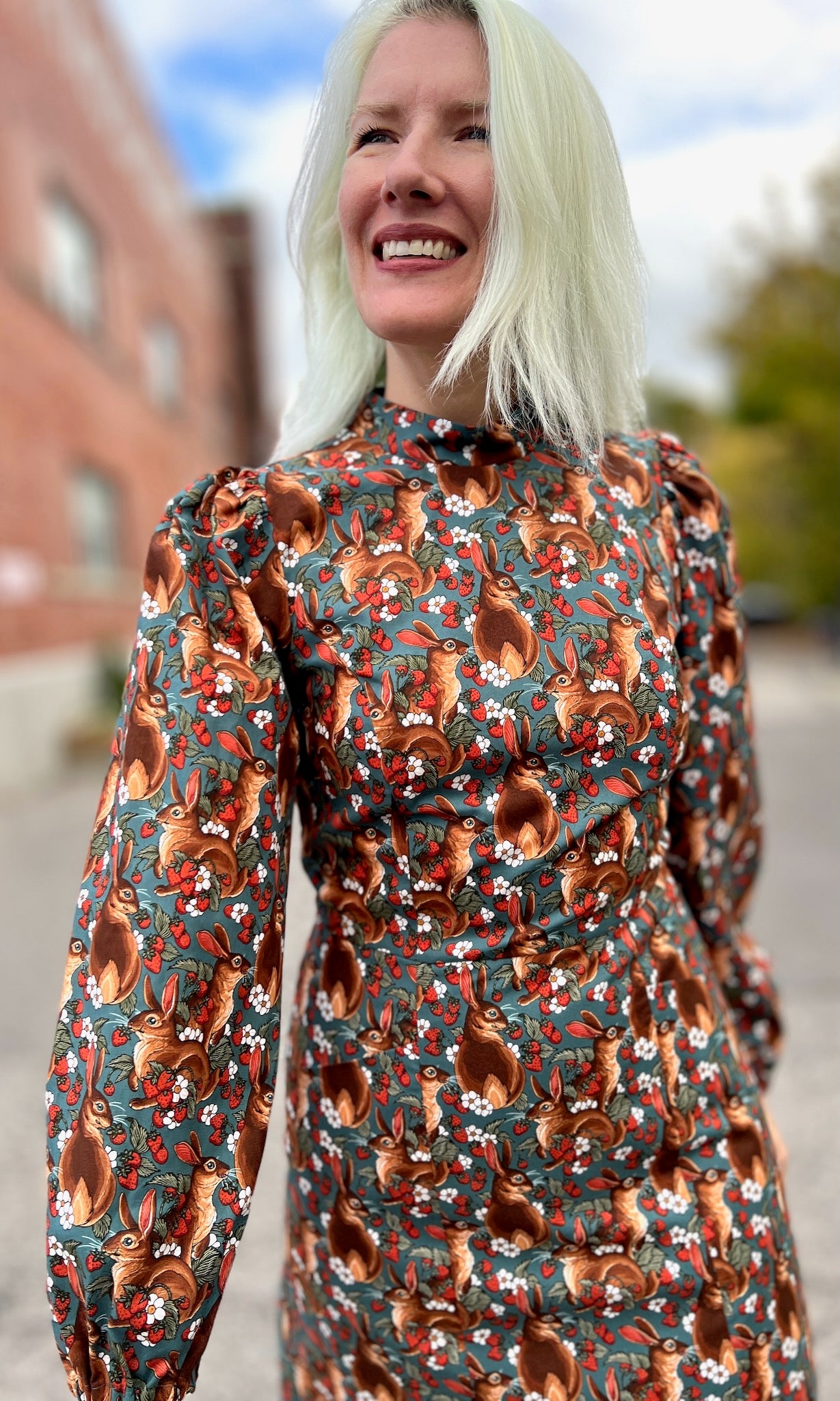 Nyctale has become a staple cut at Birds - we first ran it way back in 2020! It is a fitted sheath dress with a stand collar, full sleeves that gather into a cuff, and flat pockets on the skirt. The body of the dress is 100% cotton, and the skirt is lined in OEKO-Tex certified 100% cotton voile. It closes with a back invisible zipper.