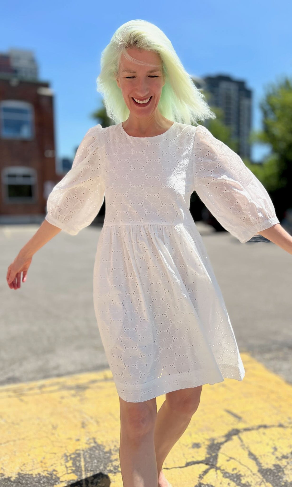 Bluebonnet is made of 100% cotton eyelet, and the body is lined in matching OEKO-Tex certified 100% cotton voile. It can be hand or machine washed on a cold, delicate cycle and hung to dry. This dress has a very relaxed silhouette, so if you would like a fit similar to what you see on the models, you can follow our size chart recommendations for your body measurements here.