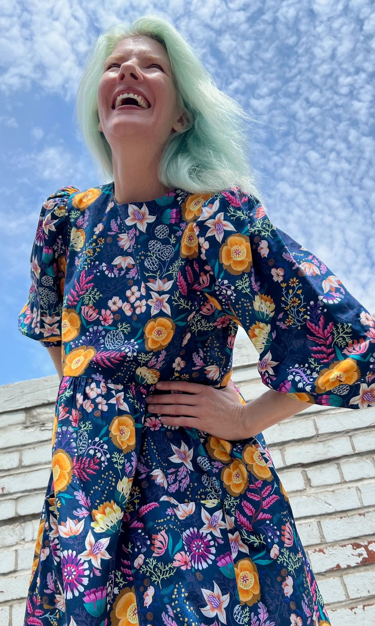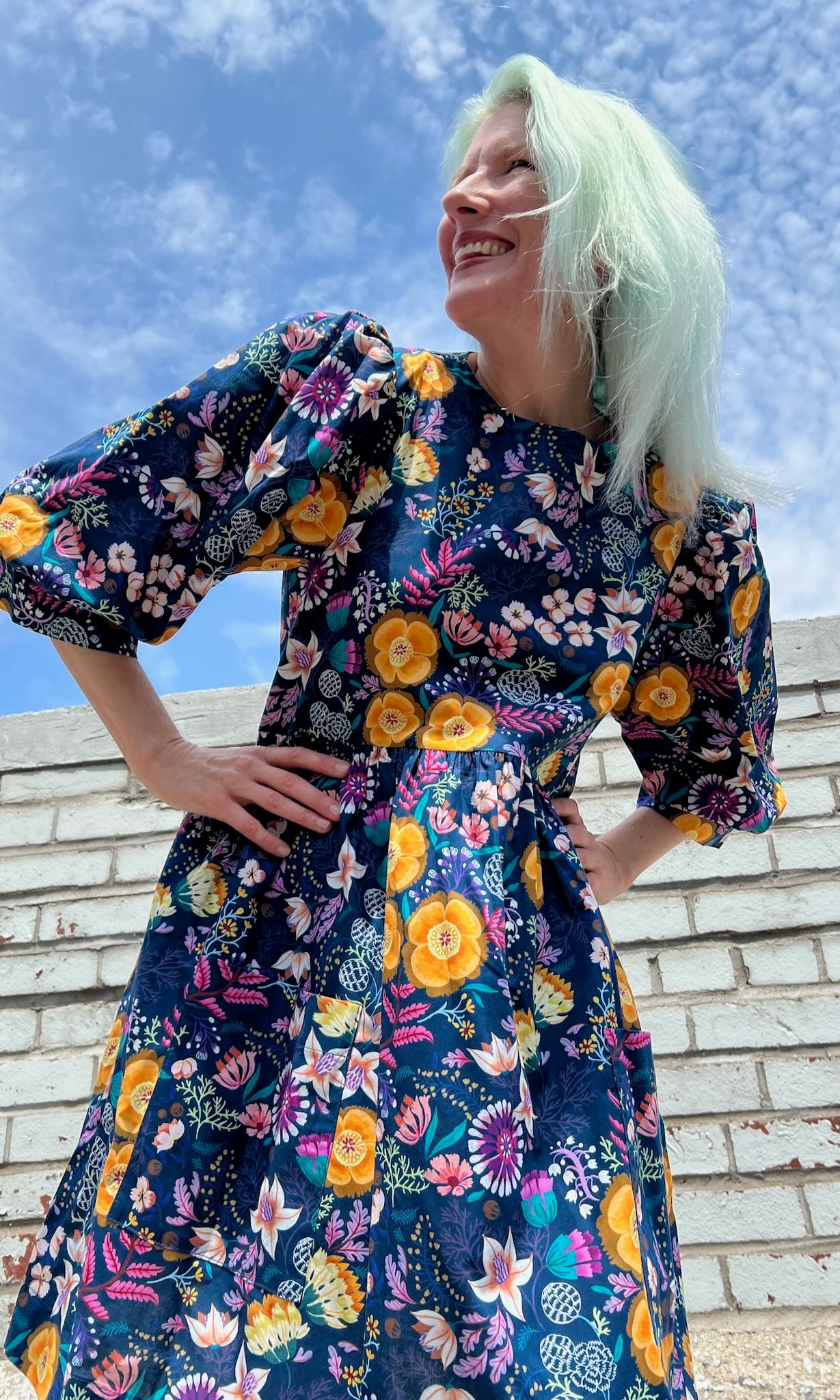Devil Downhead is made of 100% cotton, and can be hand or machine washed on a cold, delicate cycle and hung to dry. This dress has a very relaxed silhouette, so if you would like a fit similar to what you see on the models, you can follow our size chart recommendations for your body measurements here.