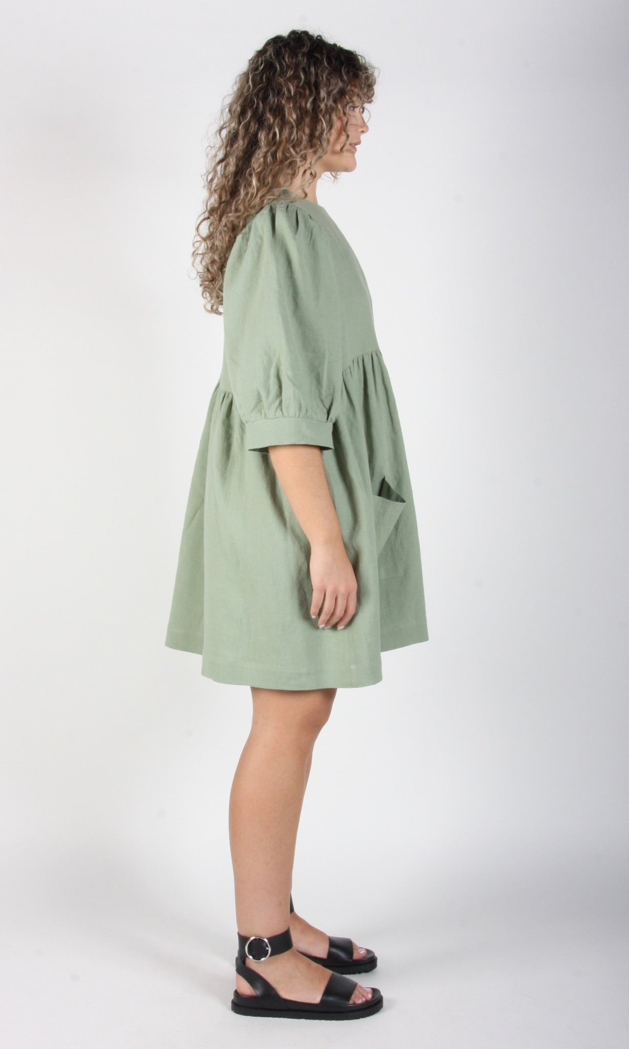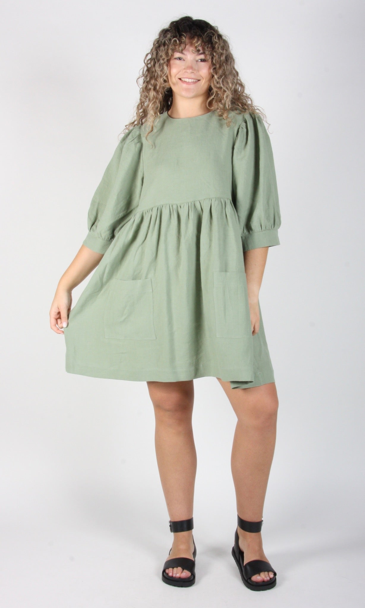 Devil Downhead has become one of our most beloved cuts ever! It's a puffy, dreamy babydoll dress with front patch pockets and an ultra full elbow-length sleeve that gathers at the cuff. It pops on over the head, and closes with a button and loop at the back neck.