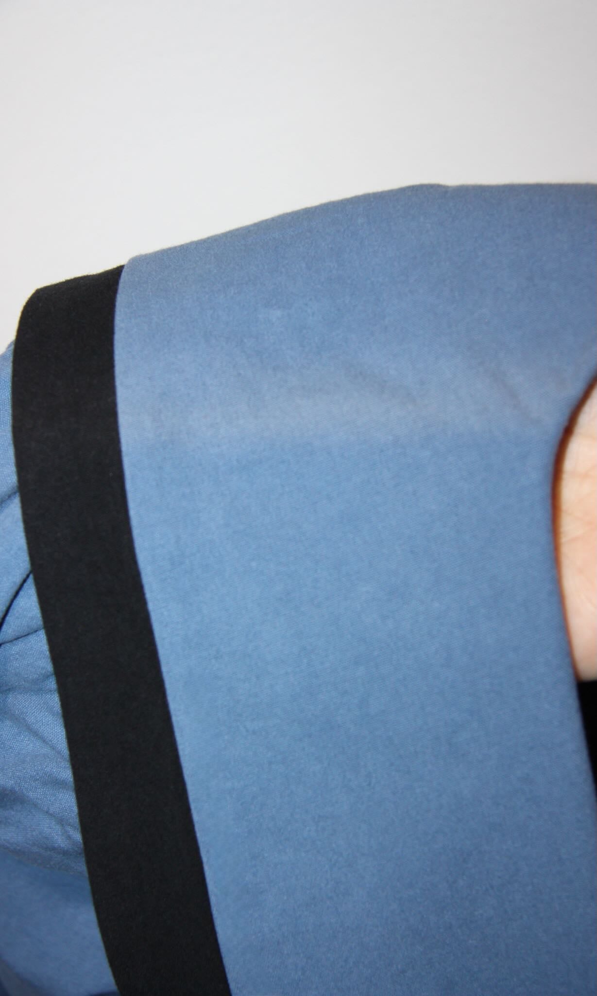 Fulvetta has a full skirt with generous in-seam pockets, a V-neck with button-front placket, full sleeves that gather into a contrast cuff, and a the perfect, oversize sailor collar with black edging.