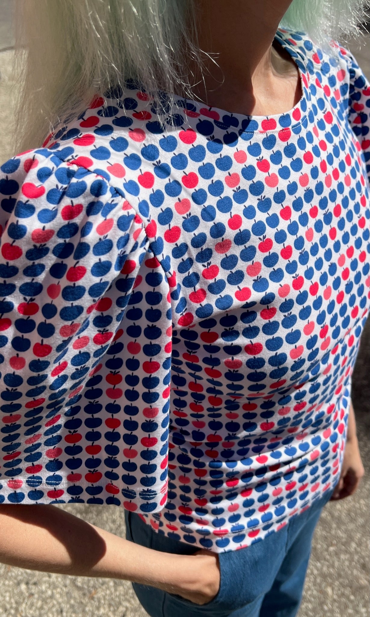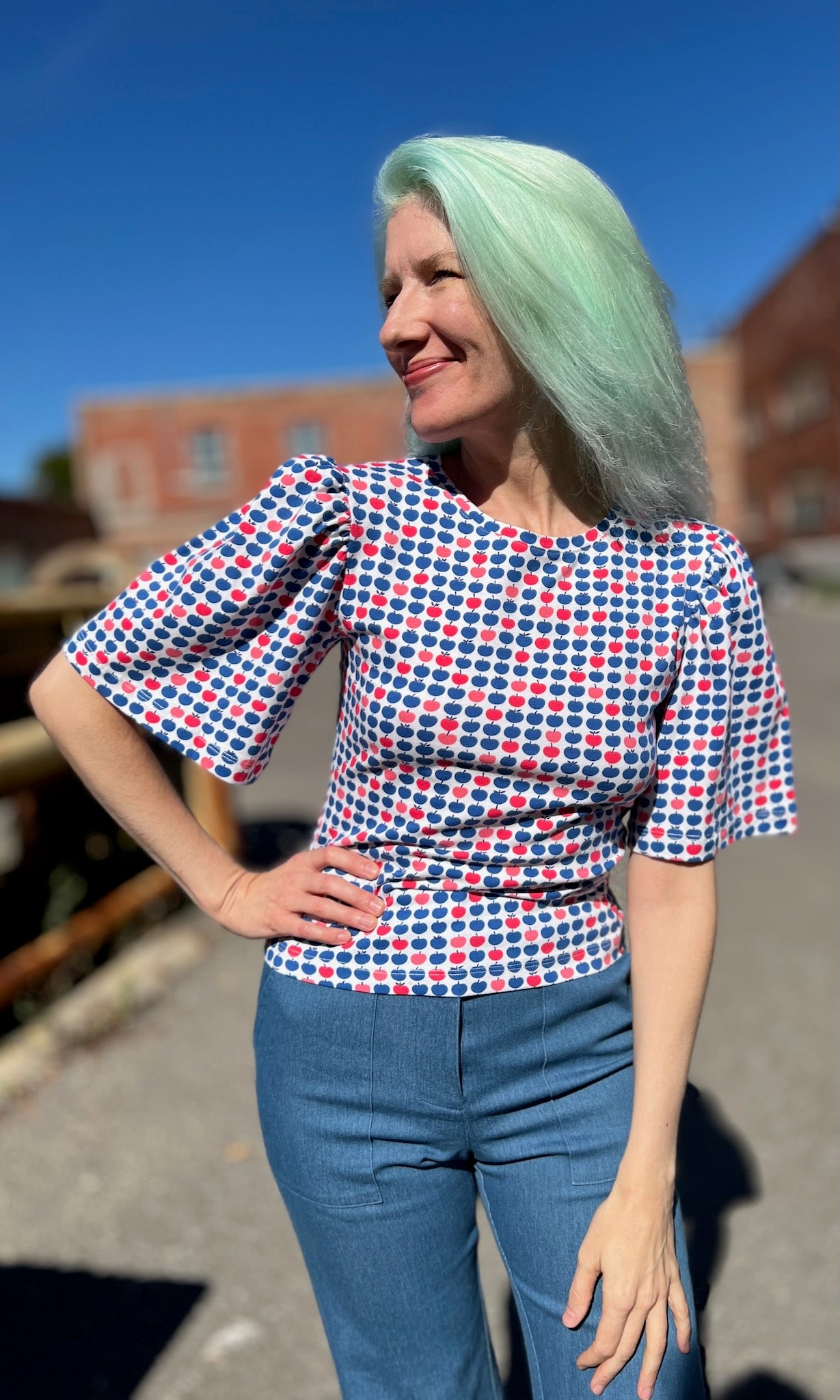 Peahen is a crew-neck knit top with an elbow length full sleeve that is gathered at the shoulder. The fabric is a soft cotton jersey that contains 95% cotton and 5% spandex. It's also available in Call My Name and Maud!