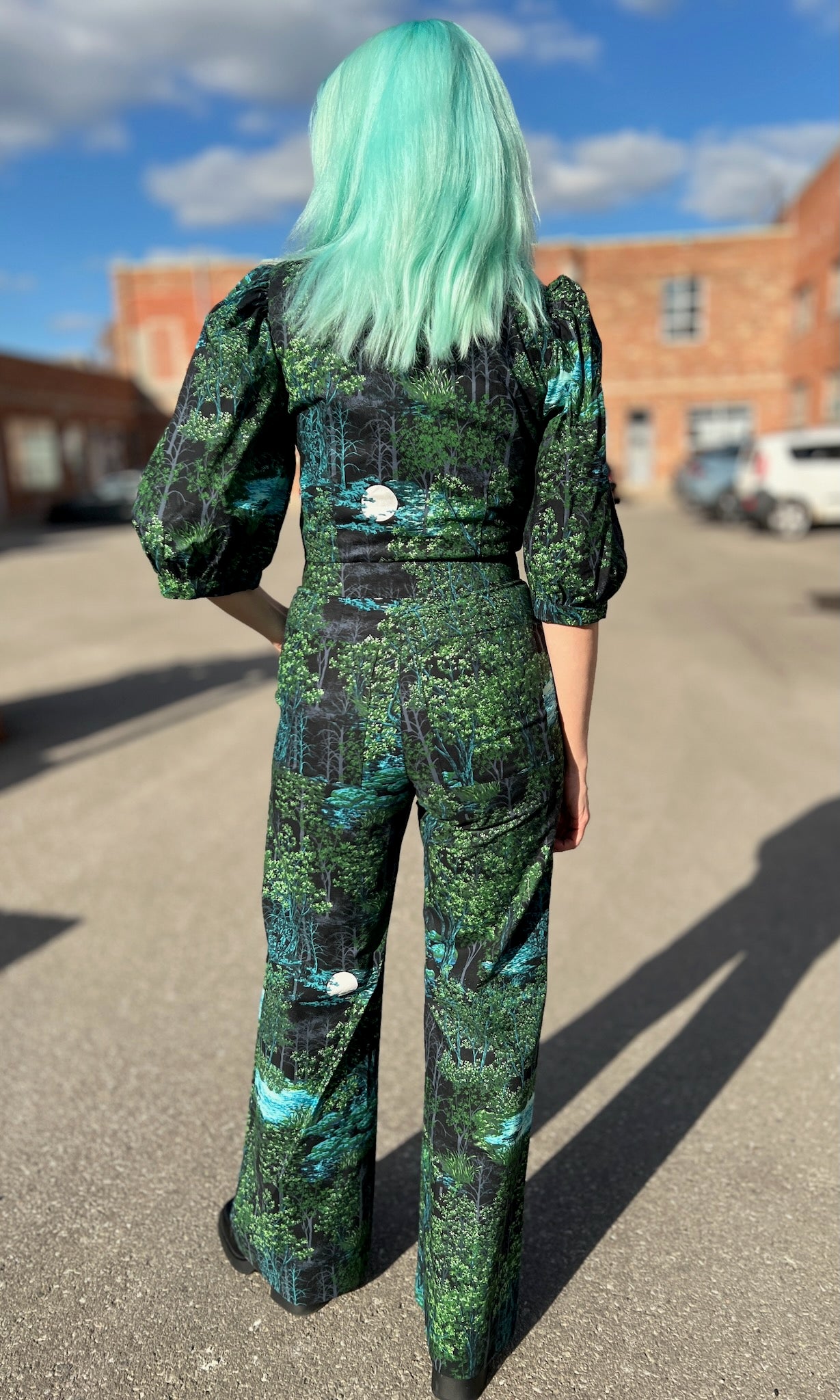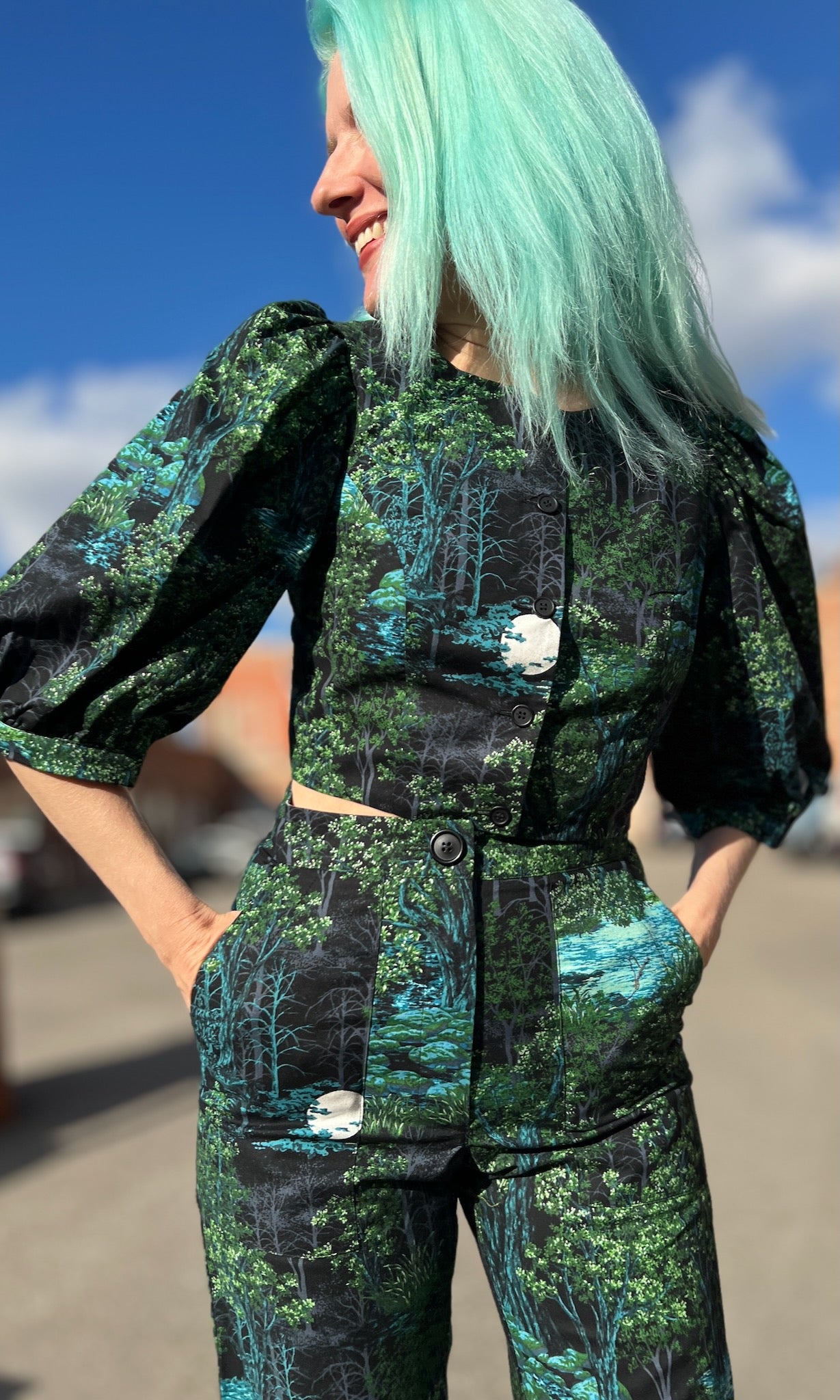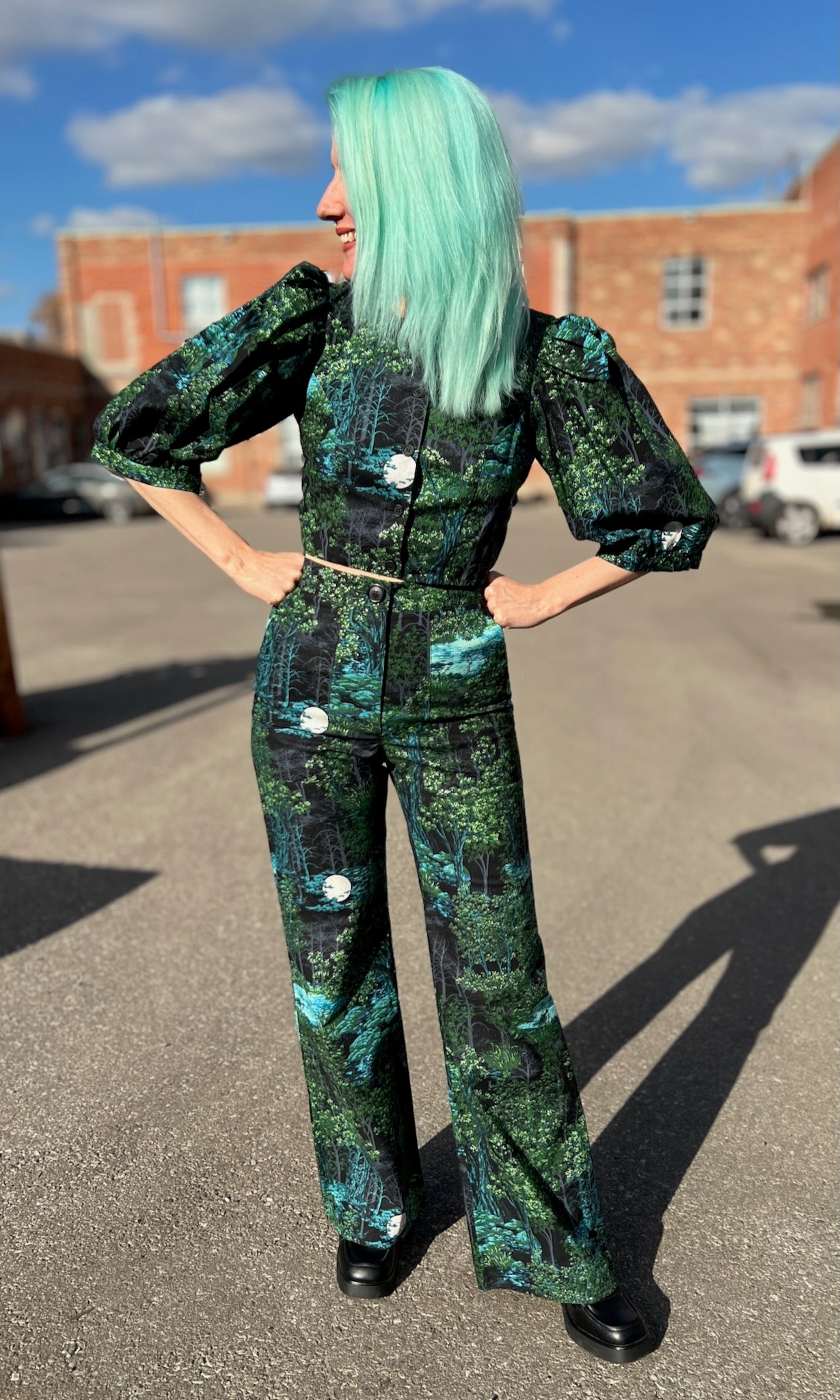 We first used Sleepwalker in our FW21 collection, and I have honestly never gotten over it! It has such a beautiful, gloomy gothic vibe with its rich green nighttime forest scene and full moon. We had it custom re-printed for the season and I'm so happy to have it back in our collection!