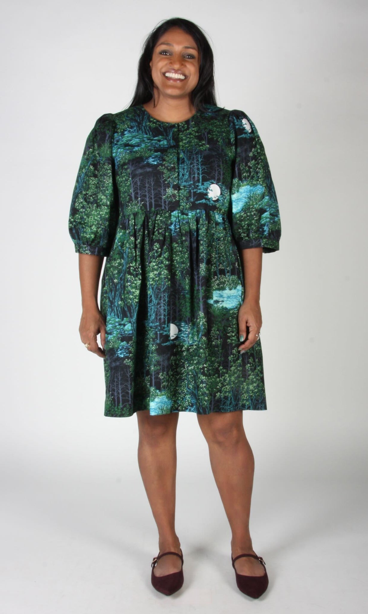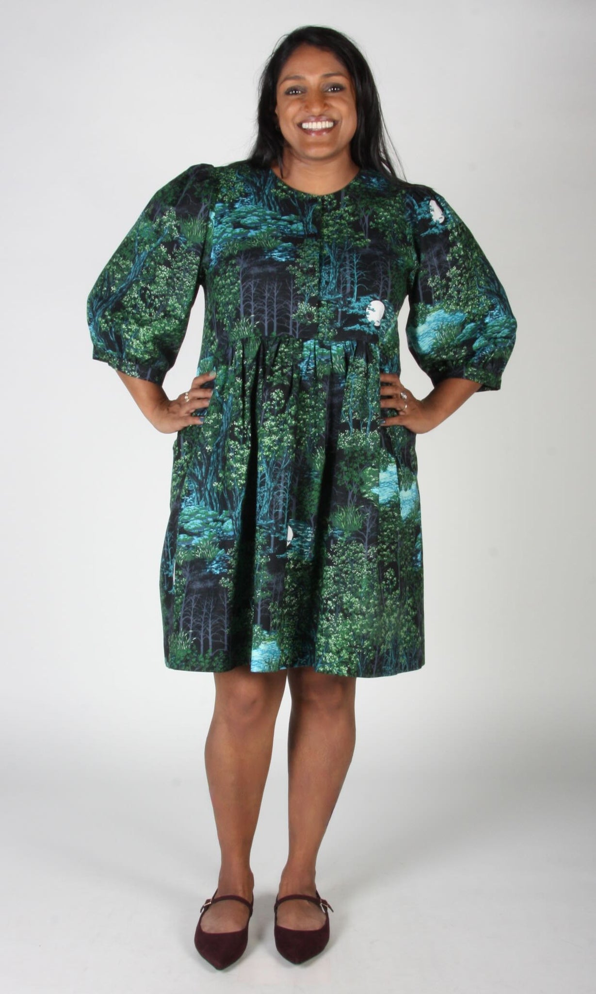 Cinnamon Bittern is a relaxed fit dress with generous in-seam skirt pockets and full sleeves that gather into a cuff. It pops on over the head and closes with four buttons down the front. This dress is available in three beautiful prints - Night Owls, Parlour, and this gorgeous cotton, Sleepwalker!