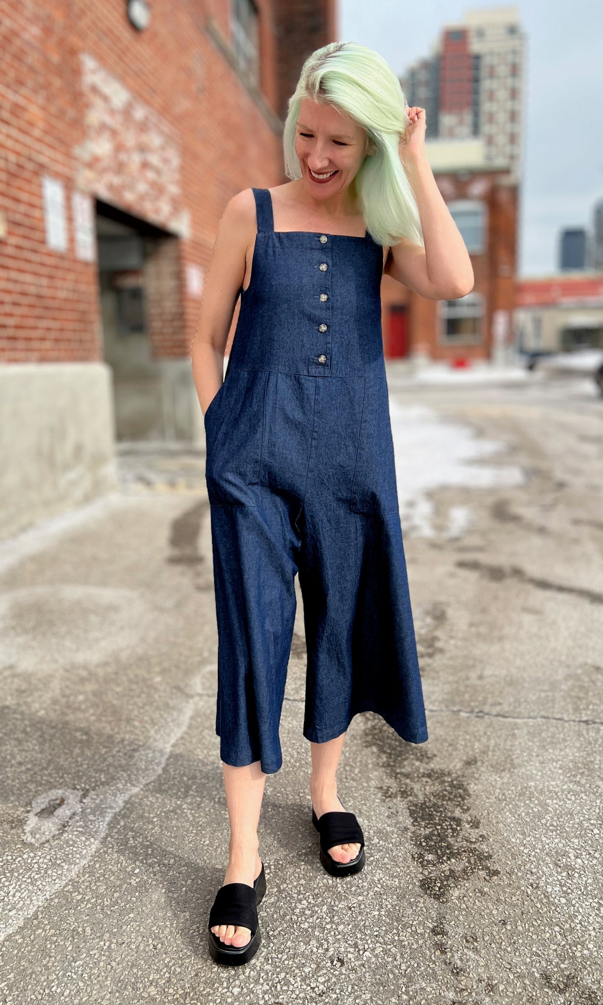Firecrest is a step-in style jumpsuit with pockets and a front button closure. It's made of a very soft, lightweight OEKO-TEX certified cotton denim, and the jumpsuit has been pre-washed! This style is also available in Medium Wash.