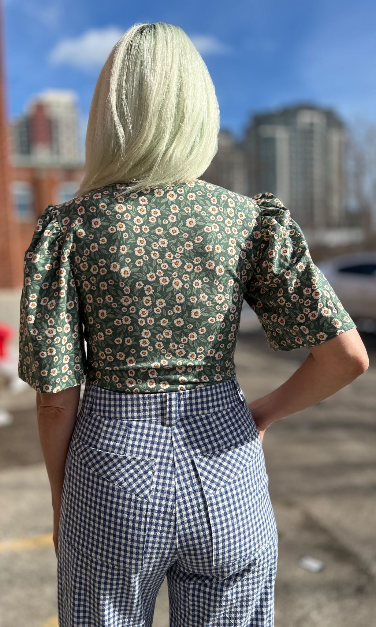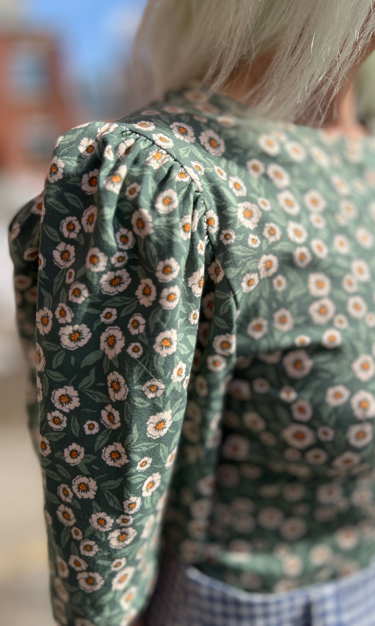 Peahen is a crew-neck knit top with an elbow length full sleeve that is gathered at the shoulder. The fabric is a soft cotton jersey that contains 95% cotton and 5% spandex.