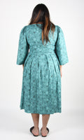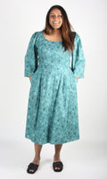 Rock Dove is a cotton dress with a midi-length pleated skirt, full sleeves, and a scooped neck.